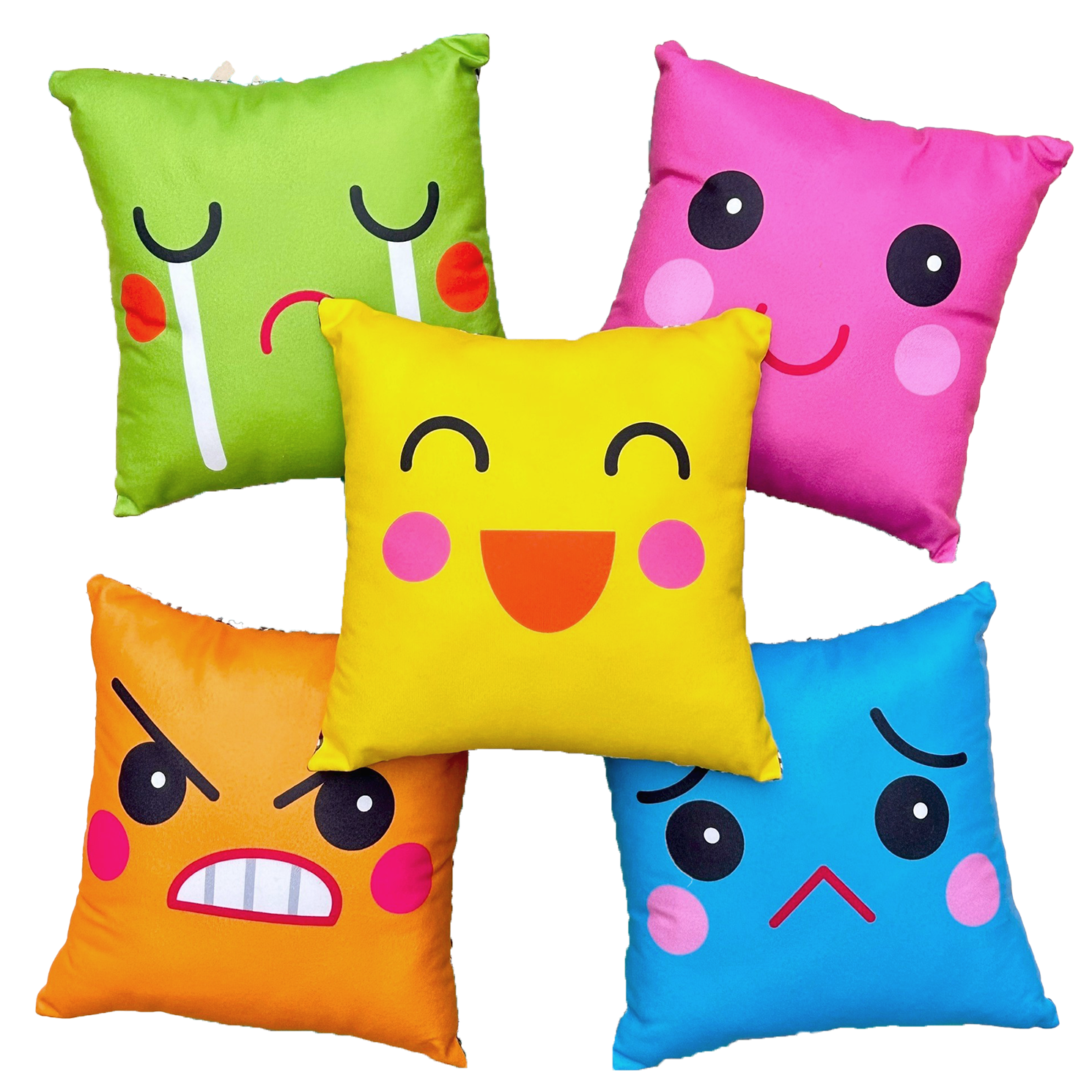 ผลิตจากผ้ากำมะยี่ยัดใยสังเคราะห์เป็นรูปหมอน ปักรูปแสดงอารมย์ เสียใจ ดีใจ เศร้า โกรธ และอารมณ์ปกติ , ขนาด25 x 25 x 11 ซม. หมอนนุ่มนิ่ม กอดง่ายพกพาสะดวก
