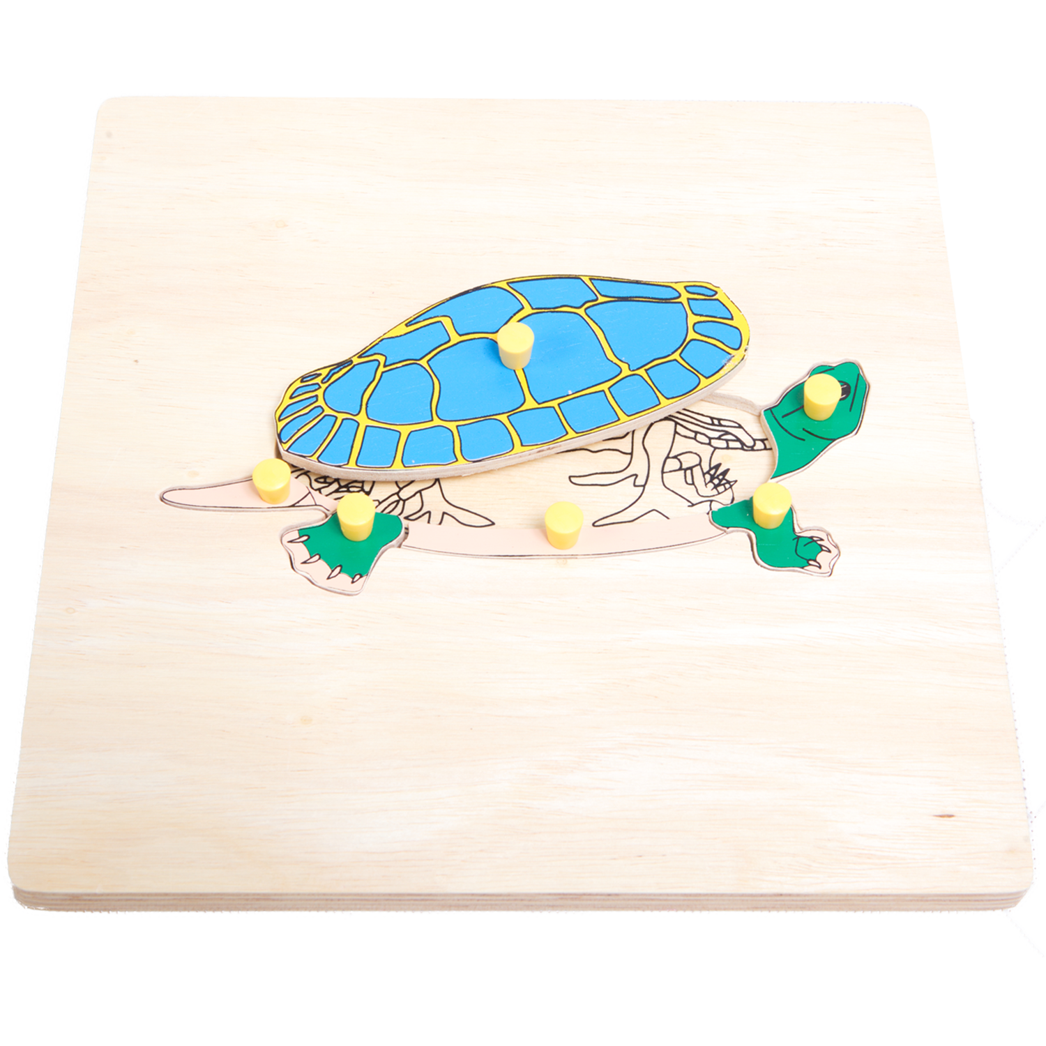 ผลิตจากไม้อัดยางพารานำมาพิมพ์เป็นรูปเต่า พน้อมฉลุชิ้นส่วนออกมา ด้านล่างเป็นโครงกระดูก