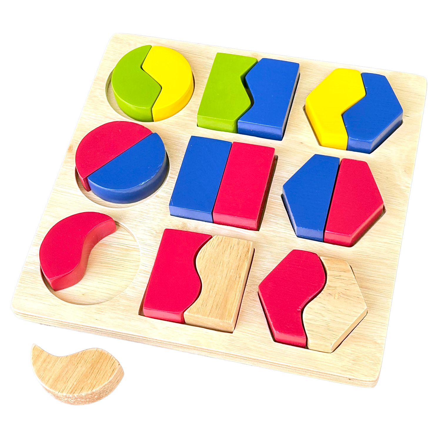 ผลิตจากไม้อัดยางพาราขนาดความหนา 9 มม. ตัดเป็นรุปสี่เหลี่ยมขนาด 20x20 ซม. ฉลุเป็นรูปทรงเรขาคณิตจำนวน 9 ทรง แต่ละทรงแยกชิ้นส่วนกัน เพื่อวัตถุประสงค์ในการสอนสี จำนวน และ เศษส่วน